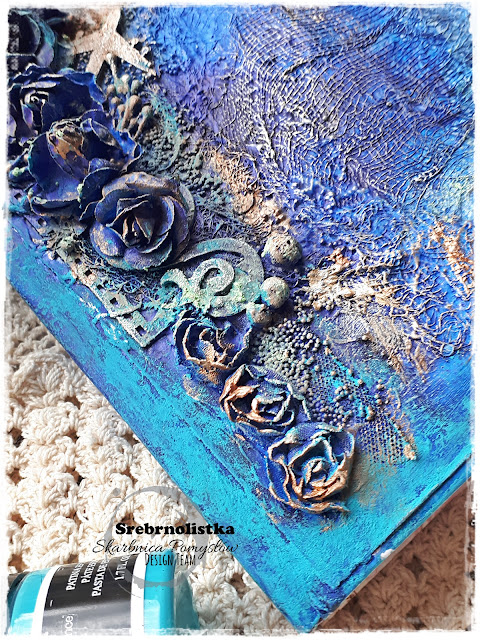 Dziś w ramach inspiracji na blogu Skarbnicy Pomysłów przygotowałam mediowy notes. Powstał jak zawsze na bazie zeszytu w twardej oprawie, którą okleiłam papierem do scrapbookingu. Tutaj to były papiery AltairArt z kolekcji Body&Soul, głownie dlatego, że mają gramaturę 190 gsm, więc dobrze sie bigują i nie pękają przy tym. Nie widać ich, bo w mediowym szaleństwie zostały całe pokryte najpierw gessem, a potem pastami i mgiełkami. Dodałam gazę, koraliki oraz mikrokulki, kwiaty, tekturki i róże na tiulu oraz pręciki. Po przyklejeniu ich do okładki pokryłam gessem i pokolorowałam mgiełkami. Dodałam akcenty za pomocą fantastycznych past art alchemy do efektu patyny, które zresztą są widoczne na zdjęciach :) - szczególnie ta w kolorze ciepłego złota przypadła mi do gustu, w razie potrzeby można nią zastąpić pasty woskowe takie jak inka gold